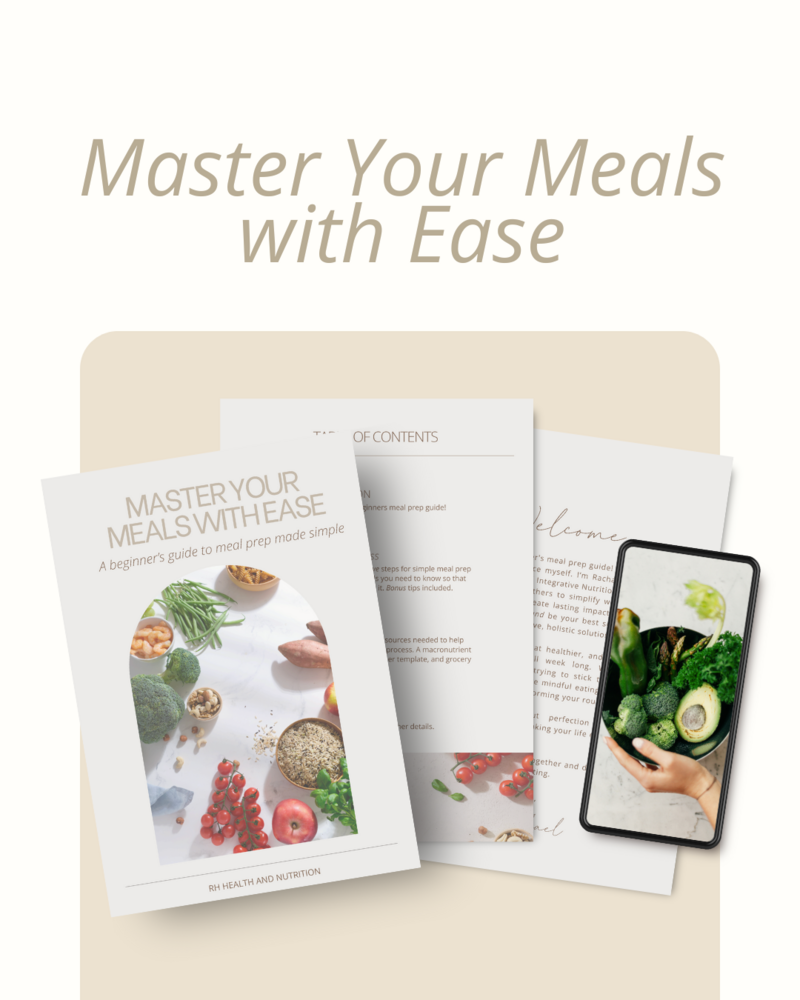 Get ready to save time, eat healthier, and enjoy nutrient dense, delicious meals all week long. Whether you're juggling a busy schedule, trying to stick to a budget, or simply looking to make more mindful eating choices - meal prepping is the key to transforming your routine. Meal prepping isn't about perfection - it's about consistency, progress, and making your life easier and more balanced, one meal at a time. Inside you will find the five steps for simple meal prep, all the fundamentals you need to know so that you can be successful at it, bonus tips, resources needed to help streamline your meal prep process, macronutrient food list, weekly meal planner template, and grocery list template.